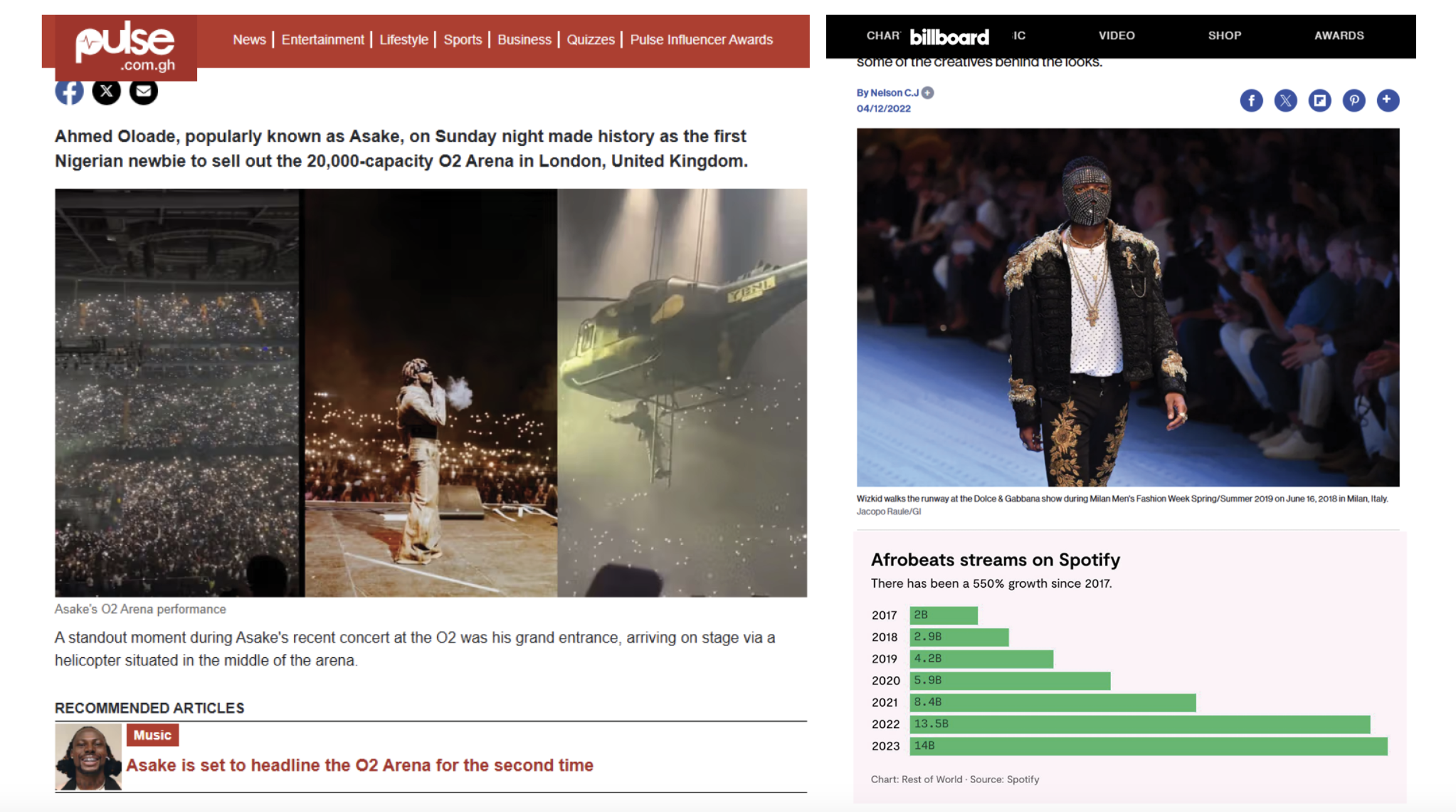 On Spotify, Afrobeats streams have grown by a staggering 550 percent since 2017. Nigeria’s Burna Boy became the first international Afrobeats artist to land a No. 1 album in the U.K., and Rema's remix with Selena Gomez hit 1 billion streams on Spotify. Stars like Wizkid, Asake, and Burna Boy are regularly selling out massive arenas like London’s O2 and New York’s Barclays Center.
